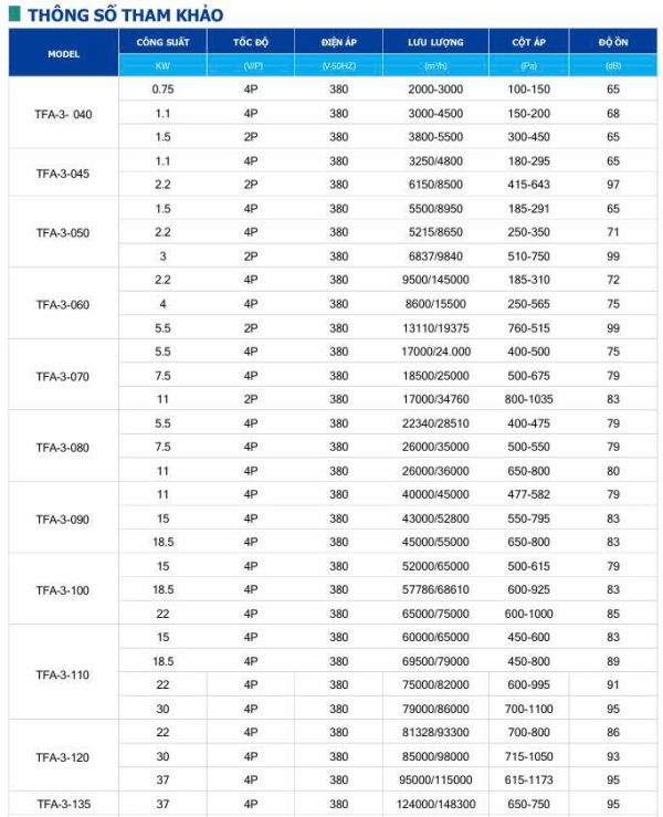- Quạt hướng trục cánh nhôm TFA-3-No có guồng cánh thiết kế đặc biệt, sử dụng loại bản cánh thép, có biên dạng kiểu airfoil được đúc thành hình chính xác, định vị trên may-ơ bằng trục kẹp.